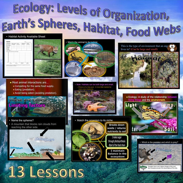 Ecology, The Big themes in eco-literacy, Levels of Biological Organization, Individual, Population, community, ecosystem, biomes, biosphere. Earth's Spheres, How the Spheres Interact, Habitat, Animal Niches, Competition, Types of Competition, Population Growth, Predator Prey Cycles and much more along the way.
