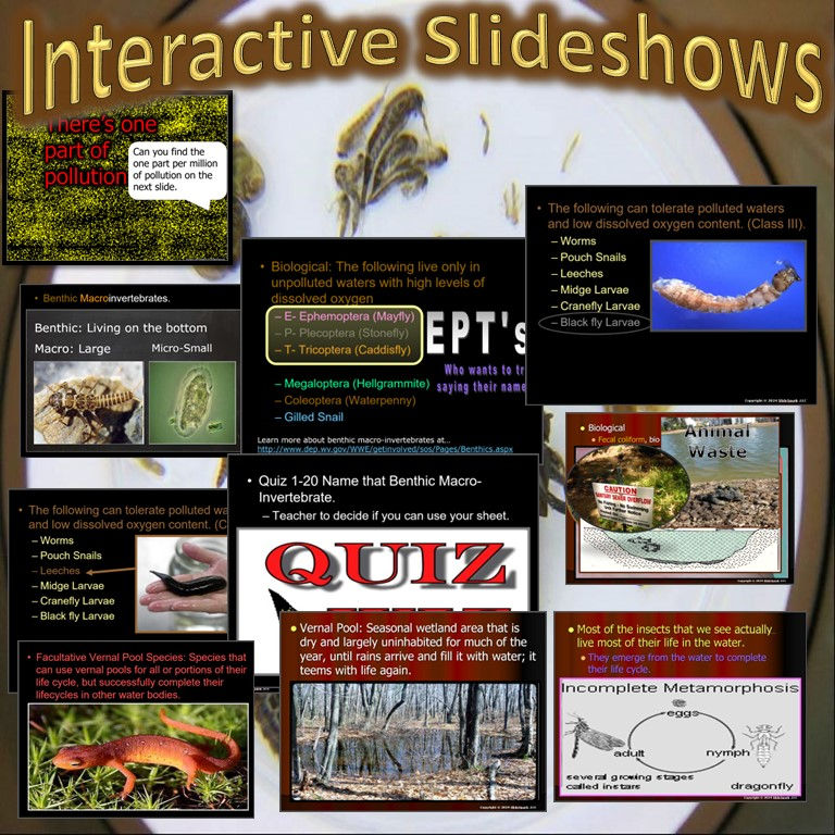 Class I, II, and III macroinvertebrates are introduced using engaging visuals and interactive challenges.